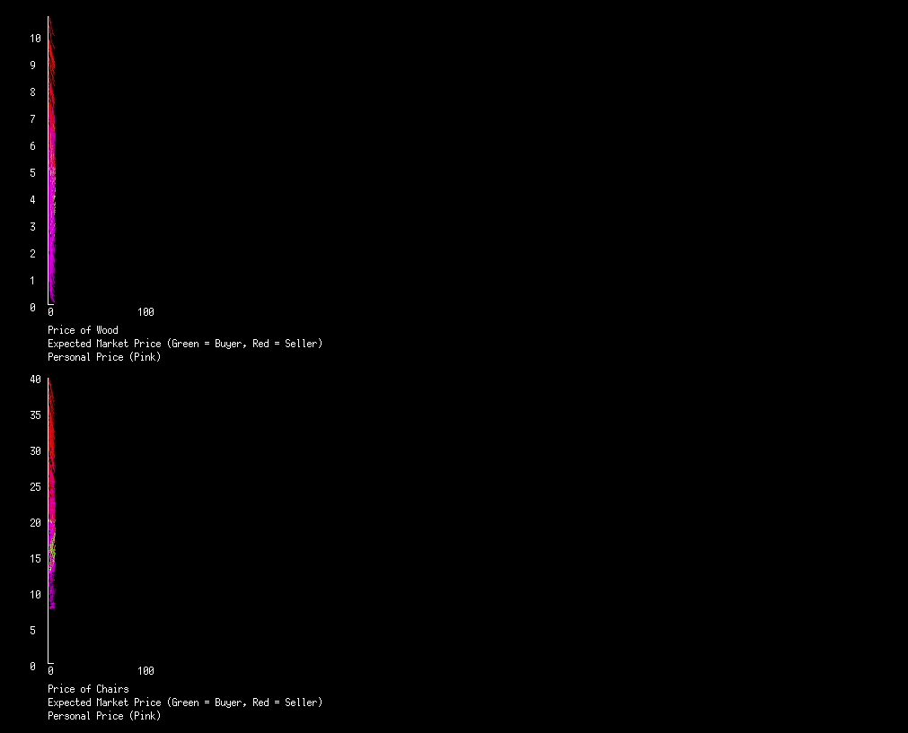 Now let’s watch the price of goods change as we give and take money from everyone. At iteration 200 we give everyone \$1000, and at iteration 400 we take away \$1000. After iteration 600 everyone gets \$10 every iteration. Note that the “Personal Price” is calculated by applying the above conversion from value to price on the actors personal value of each good.