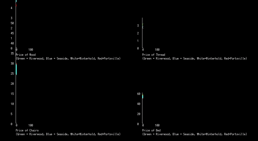 If we look at each city we see the effects of their specialization. Riverwood has cheaper wood, which also leads to cheaper chairs and slightly cheaper beds. Seaside has cheaper chairs even though wood is expensive. Portsville has cheaper thread, which makes cheaper beds. Winterhold has cheaper beds even though both wood and thread are expensive. But as we saw before, each market affects every other market, so we need to be careful when attempting to attribute cause for prices.