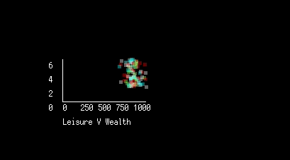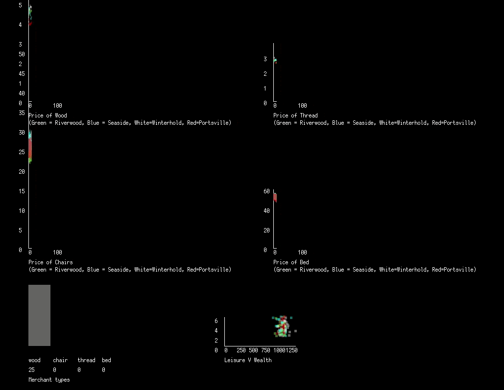 Now we add merchants between cities. Initially the cost of moving between cities is too high for merchants to do anything, but at iteration 500 we set the moving cost between all cities at \$1. We also add a tax on merchants since they hoard the money they make, causing inflation over time. Every few iterations merchants will be taxed %10 of the money they have over \$1000, which is then evenly distributed evenly amongst all the locals. Lets also track what merchants are trading in, as well as the distribution of wealth compared to an individuals value of leisure (the idea being that perhaps the rich are rich since they don’t value leisure as much).