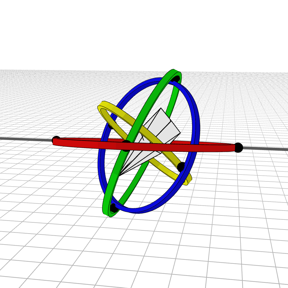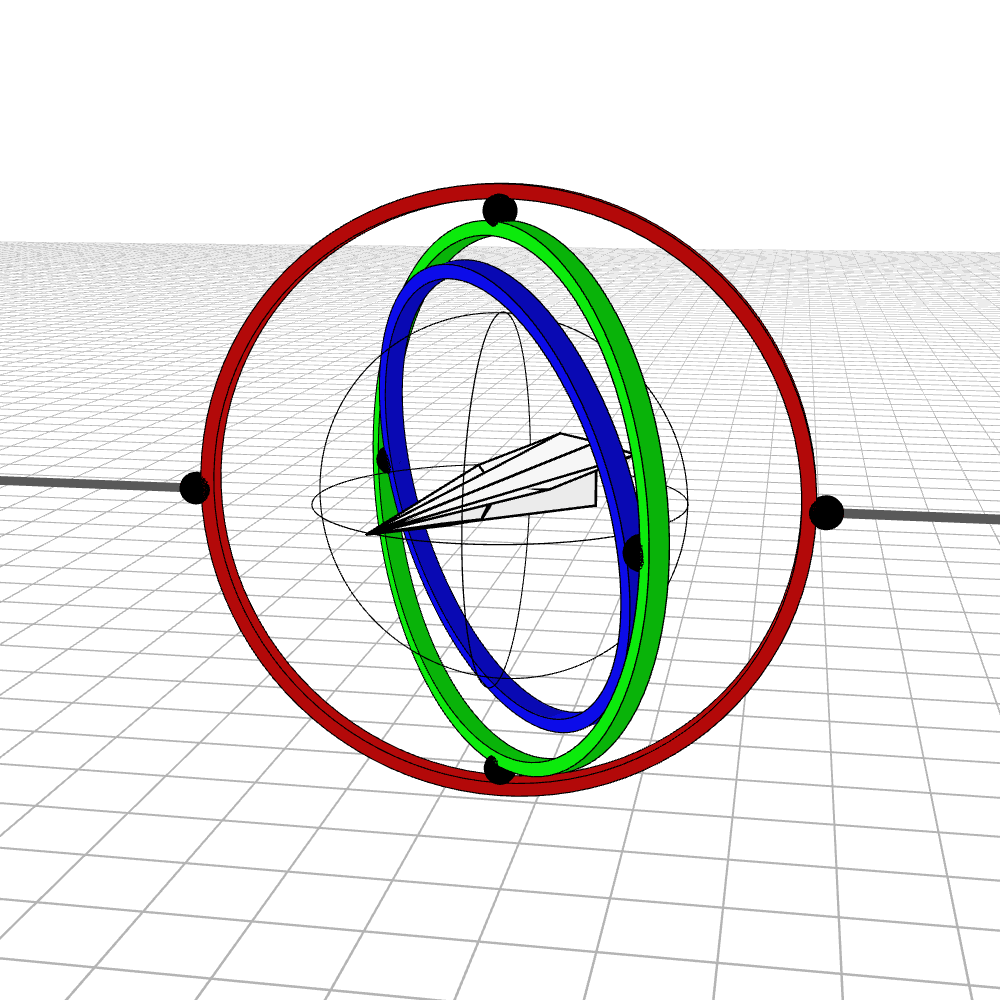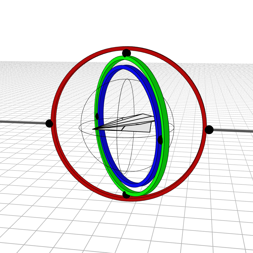 For three gimbals we had a unique set of angles that represented a rotation, so by adding a fourth gimbal we enable a rotation to be represented by many different possible sets of angles. Below we see how the airplane is staying still while the gimbals can move (not at any angle, they still need to produce the desired rotation, but we still see how there is more then one set of angles to map to a rotation).