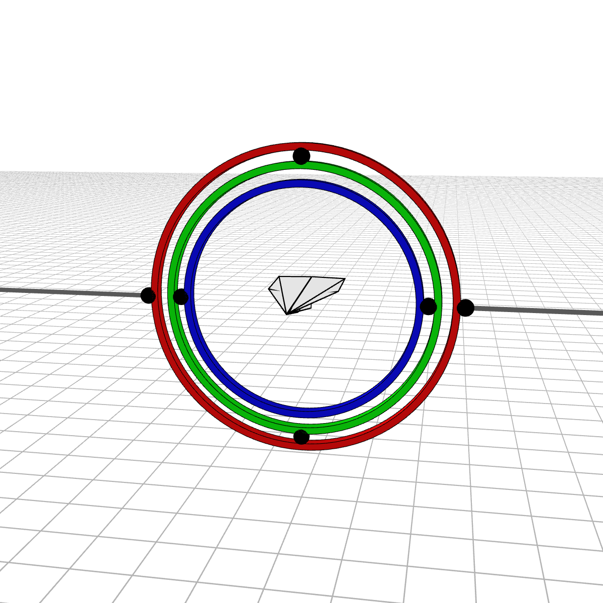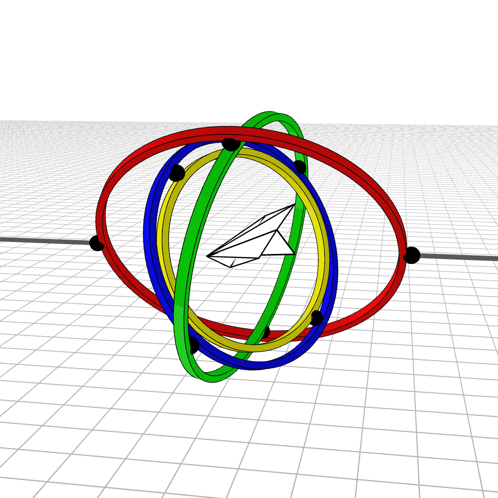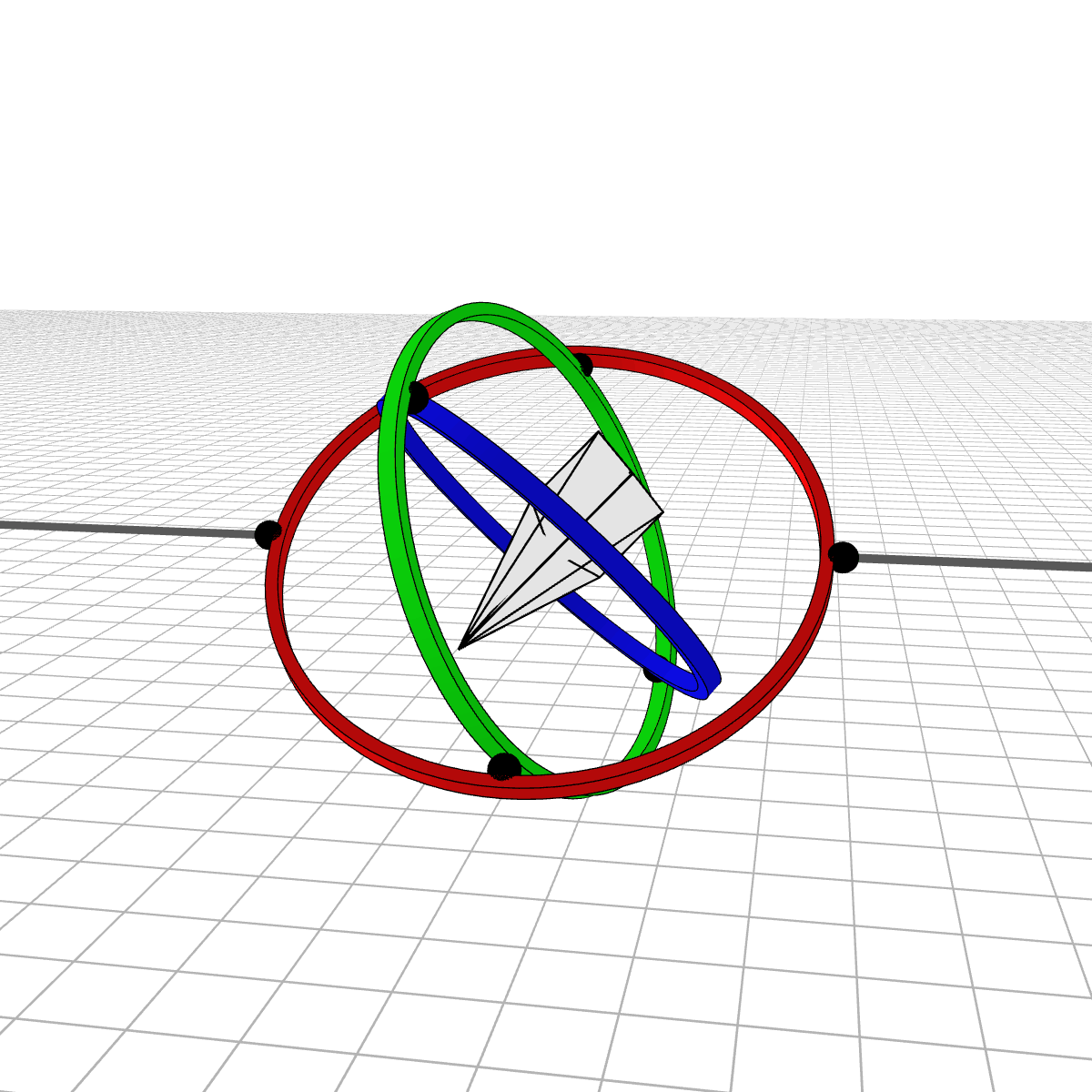 For three gimbals we had a unique set of angles that represented a rotation, so by adding a fourth gimbal we enable a rotation to be represented by many different possible sets of angles. Below we see how the airplane is staying still while the gimbals can move (not at any angle, they still need to produce the desired rotation, but we still see how there is more then one set of angles to map to a rotation).