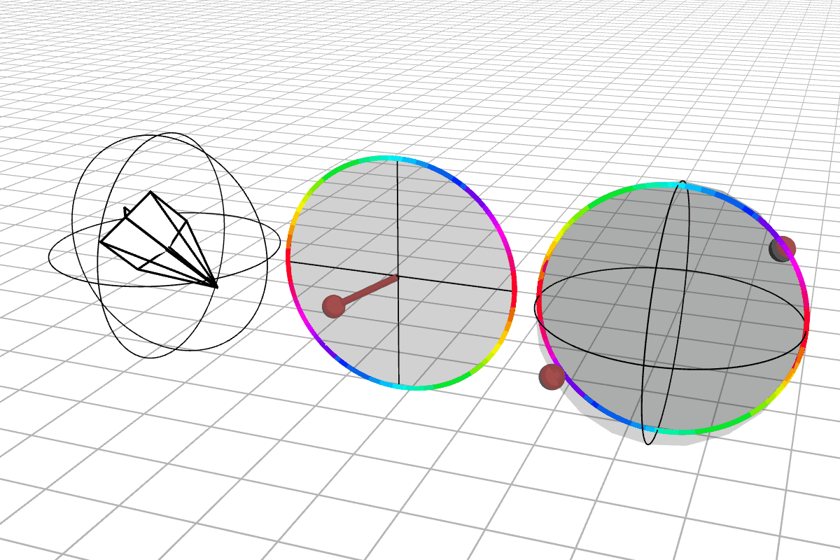 This can take a minute to understand, so please stare at the above and below animations for a sufficient amount of time. Below we see a rotation represented in three different ways: a rotated object, the Rodrigues vector, and the two points on the sphere made from the glued-together copies of the Rodrigues vector space. Notice how a rotation is represented twice on this new sphere, which is what allows it to be continuous everywhere.