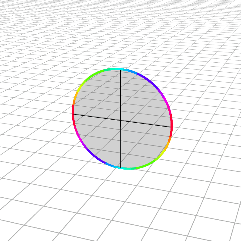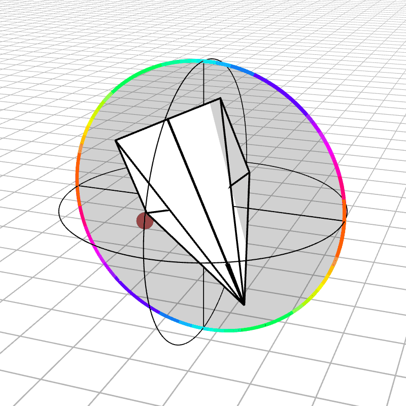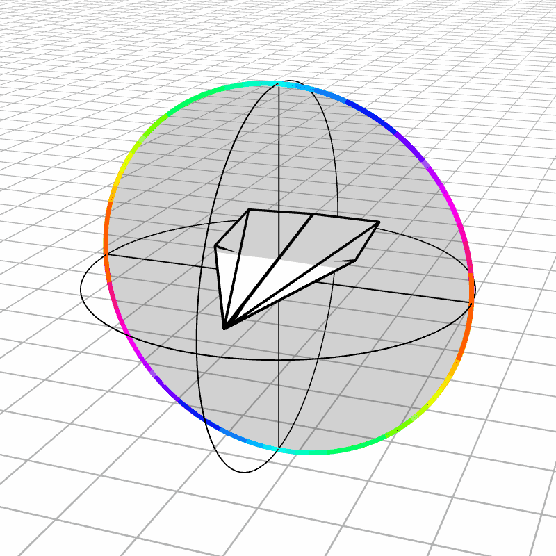 In our context, this space would represent 3D rotations where one axis is fixed in place. The direction of a vector in this circle represents a 3D axis to rotate around, and the magnitude represents the angle by which to rotate. Here we can see the airplane can rotate along only 2 of its degrees of freedom. We also color the edge of the space such that identified points are the same color.