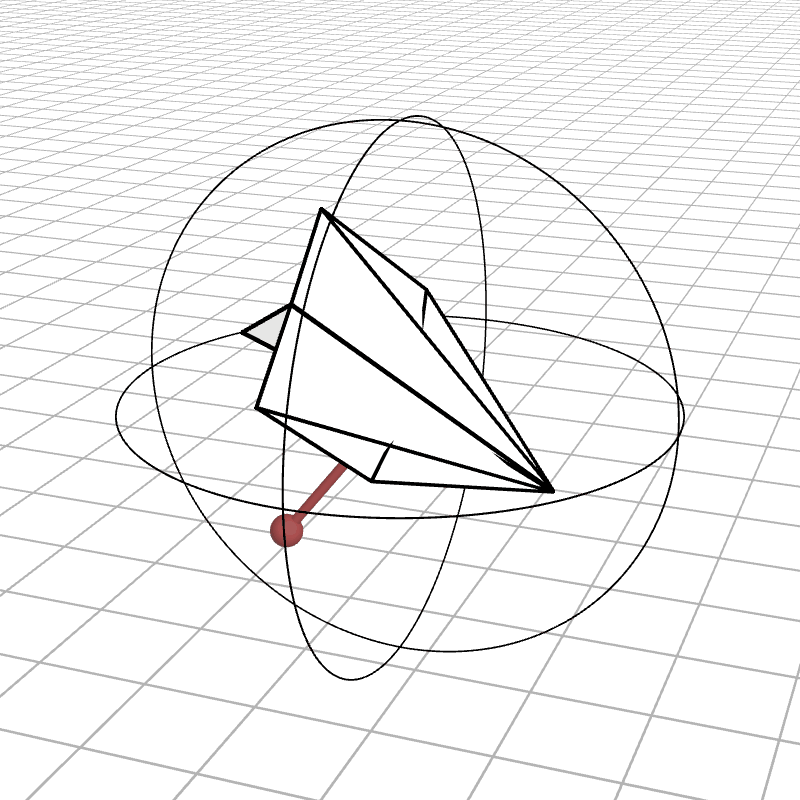 Below we see the airplane moving randomly as we adjust the gimbals to avoid singularities. Every frame we calculate the set of angles that maximizes the distance to a singularity (the determinant of the Jacobian matrix) while always satisfying our desired rotation.