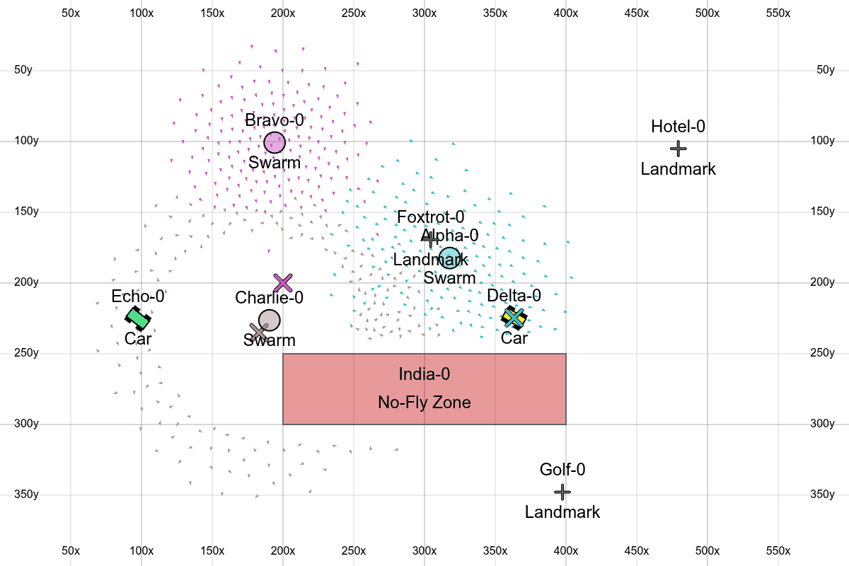 Here we see all the features, with one swarm traveling through waypoints, another encircling a position, and another following a car around a no-fly zone.