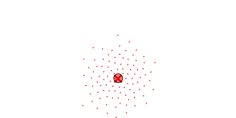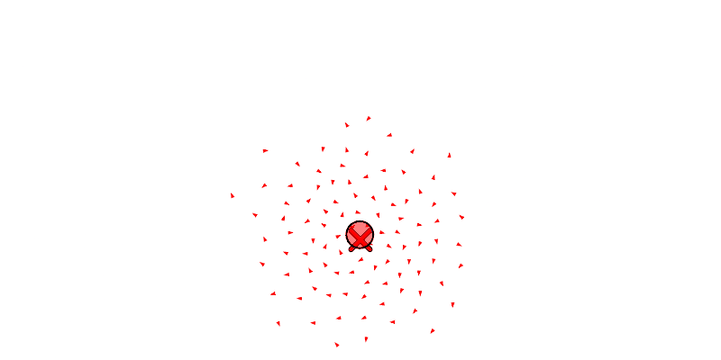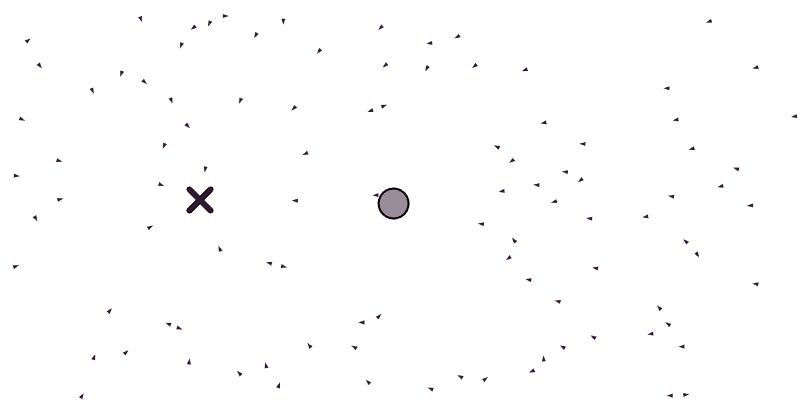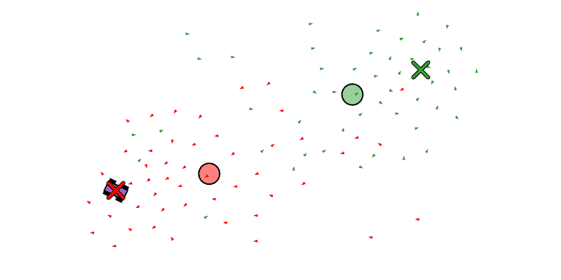 We see each boid as a triangle, the center of mass of all the boids as a circle, and the target position of the swarm as an X.